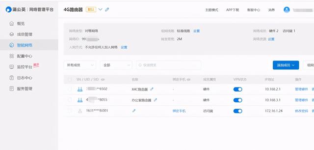 添加完成员之后就完成了组网。大家注意看,我是在办公室里已经有一台路由器了,我把蒲公英X4C与办公室的路由器组成了局域网。组网其实就是建立了一个虚拟局域网,我的蒲公英X4C路由器和登录之后的访问端成员,都跟办公室里的路由器处于同一虚拟局域网了。