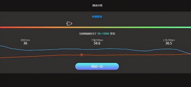 最后,再来测试一下,路由器使用4G网卡上网时的网速,下载速度大概在58Mbps,上传速度在36Mbps,这个速度接近于50兆的家庭宽带呢,看视频、玩游戏都没有问题了。
