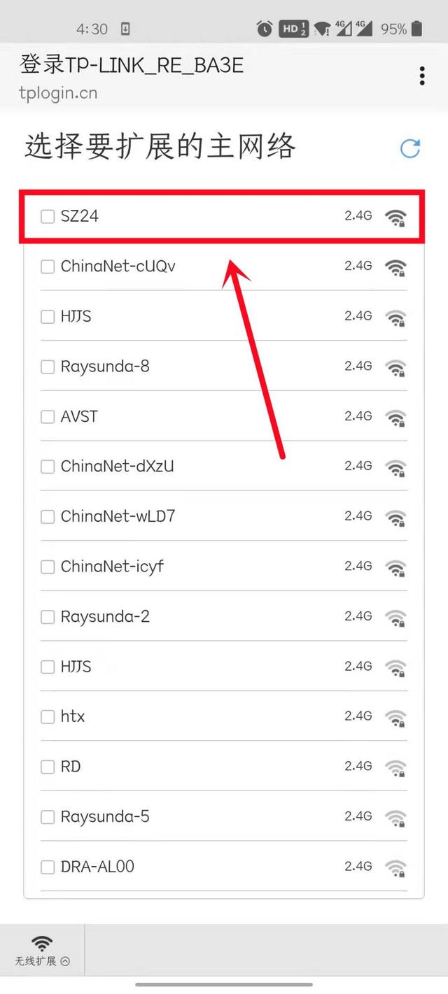 第4步:扩展器自动扫描周围的无线网络,扫描完成后,自行选择要扩展的主网络(2.4G网络/5G网络)。