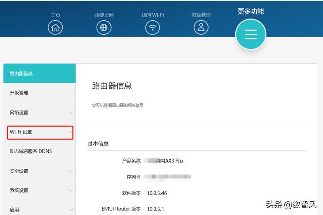 3、在更多功能界面,点击左边导航栏的”Wi-Fi设置“,进入到”Wi-Fi高级“子菜单。