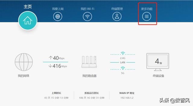 2、进入路由器的管理主页面后,点击“更多功能“进入。