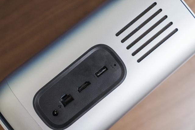 接口区域包括:1个HDMI 2.0端口、1个USB 3.0端口和3个USB 2.0端口、1个千兆RJ45网口、最下方是DC电源接口和防盗锁孔。