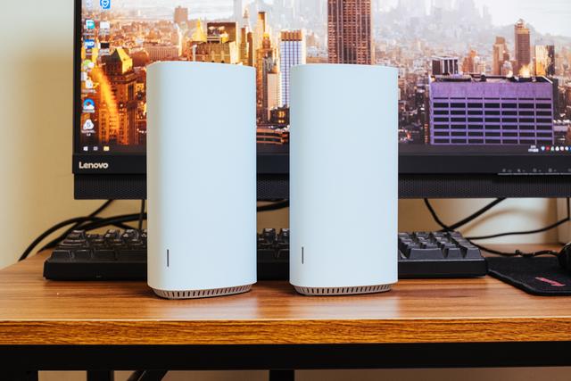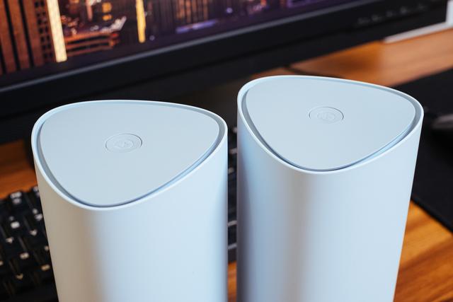 360 WiFi6全屋路由的外观设计能很好的融入居家环境,圆润三角柱形的设计,单个尺寸96.2mmX98.6mm×198.5mm,它占用的地方很小,高度如同一瓶500ml的可乐。隐藏天线设计,内部有4颗独立信号放大器芯片,可以最大化各方位信号覆盖,这款双套装路由器适用于大平层、复式、别墅等户型,利用Mesh分布式组网,不用再特别考虑中心化摆放,也能做到最大化覆盖。外壳使用的是天青色的工程塑料,在外层是有轻微磨砂质感的类肤涂层,这个类肤设计虽然触感是比较不错的,但是沾灰后比较容易变脏,也难清洁。