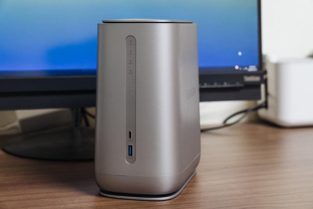 采用了竖式排列指示灯和USB接口,从上到下:电源指示灯、网络指示灯、硬盘工作状态指示灯、USB-C 3.0接口、USB-A 3.0接口。