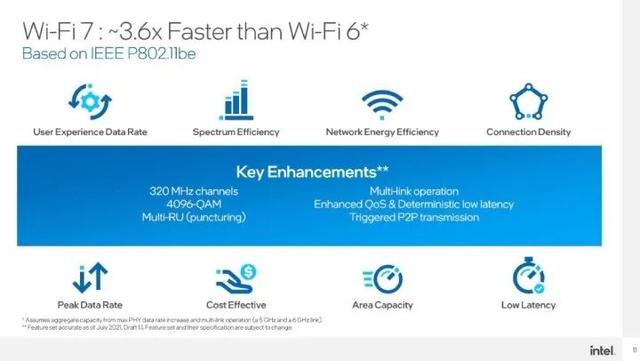 在最新宣发文档中,Intel介绍了WiFi 7标准,也就是IEEE 802.11be。据Intel介绍WiFi 7可提供30Gbps以上的无线连接速率,是Wi-Fi 6的约3.6倍。规范内容上包括调制从1024QAM升级为4096QAM,延续OFDMA (正交频分多址)。频宽从160MHz提升到320MHz,引入对新开放的6GHz频段支持(可在5.925GHz~7.125GHz范围内最高支持3个不重叠的320MHz频道),并向下兼容2.4GHz和5GHz。MIMO(多用户输入输出)设计从最高8条空间流翻番到16条。