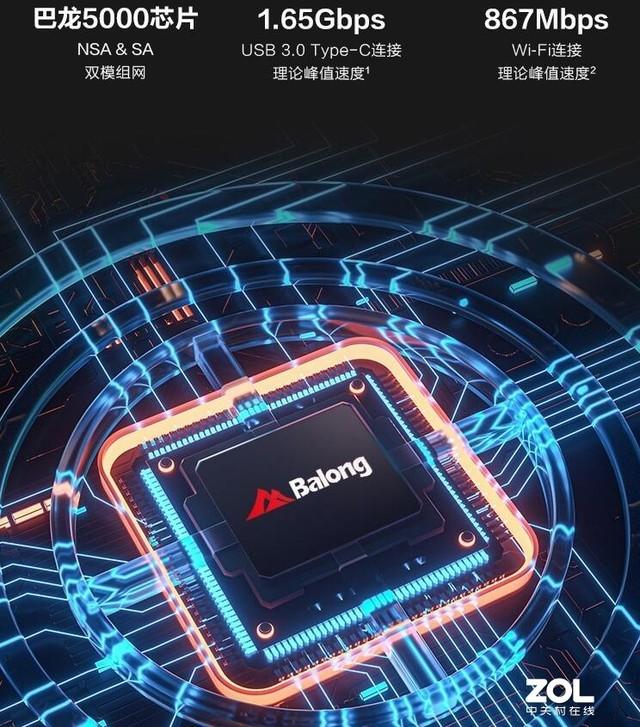 在迫不及待的进行了体验后,我们再回来详细的介绍一下这款产品。要想畅爽体验5G网络,首先离不开5G基带芯片。华为5G随行WiFi Pro内置全球首款7纳米工艺5G多模芯片巴龙5000,它可以让华为5G随行WiFi Pro持NSA/SA双模组网和三大运营商5G全网通,支持全球150+国家主流5G/4G频段,5G峰值下载速度高达1.65Gbps。