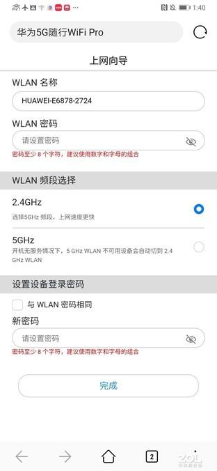 初次开机后,显示屏上会显示设备的WiFi名称。使用手机、平板、笔记本等都可以通过WiFi连接到设备,连接到设备后会自动进行初次设置。设置过程也非常简单,用户只需要在一个页面上设置好WiFi密码和管理员密码,选择合适的WiFi频段,就可以完成设置,整个流程不超过1分钟。通过WiFi再次连接到华为5G随行WiFi Pro后,就可以正常使用。