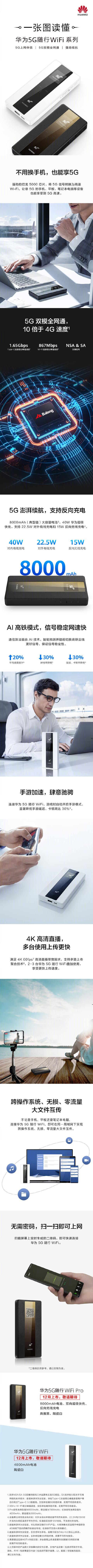 华为5G随行WiFi系列支持NSA/SA 5G双模,Type-C连接速度达到1.65Gbps,WiFi连接速度为867Mbps。Pro版内置8000mAh大容量电池,40W华为超级快充,支持22.5W对外有线充电和15W反向充电。