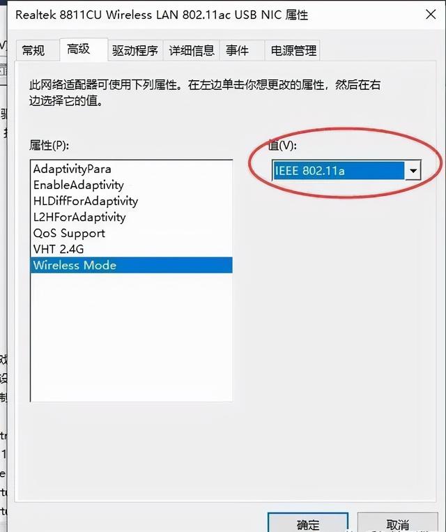 将切换至“高级"选项卡,选择Wireless Mode,在值选择”IEEE 802.11a“就可以连接WiFi的5G频段了。