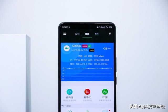 在正式了解之前,我们先来下载一个WiFi测试相关的APP—WiFi魔盒,下载安装成功之后,进入WiFi魔盒主界面,我们首先能看到当前WiFi的相关信息。例如首先映入眼帘的就是WiFi的名称了(SSID),像领势MX5502这样的中高端路由器,它发射出来的WiFi一般是双频WiFi,因此WiFi的名称中除了路由器的型号名之外,后面还会附有频段名,如MX5502 5G或MX5502 2.4G等。