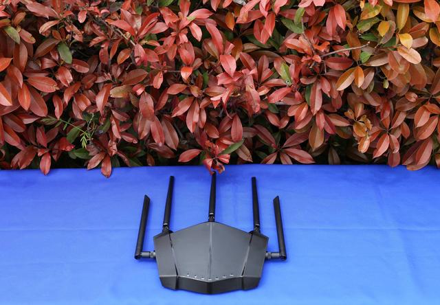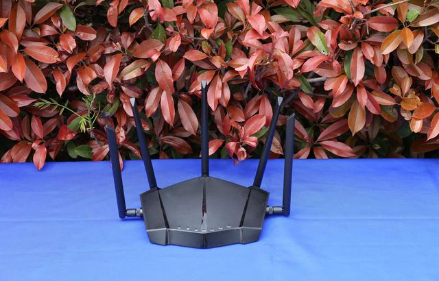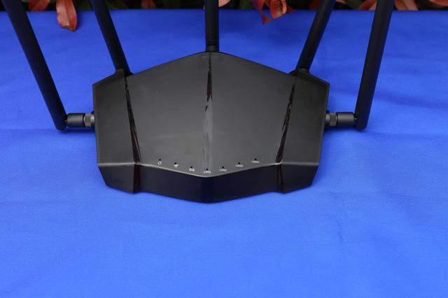 产品外型有点像豪车的前端,又有点像次世代的飞行器,亮黑色的外观,磨砂的触感,兼具神秘与时尚的感觉。路由器提供五根增益天线,都是可拆卸的,初次使用需要自己安装。接下红色的塑料盖,看到信号线采用镀金的接口,从而保证信号的清晰无干扰。