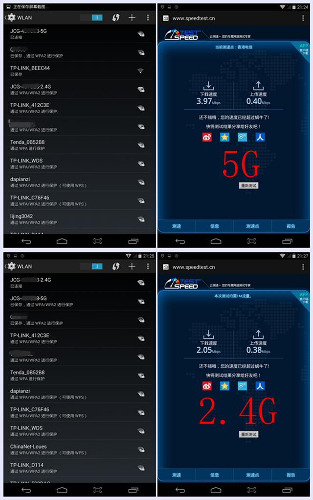 通过同一平板,测试5G及2.4G的网速,可以看到G5明显快了很多!