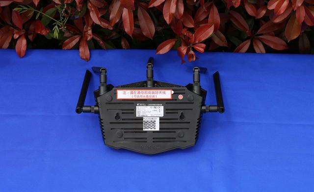 将路由器从包装中取出,其五个天线接口,均有塑料套进行保护。背后贴有一个警示标签,在通电前需要安装好天线。但是产品已经换代了,不再需要光盘驱动了,所以标签需要更新了。撕开标签,是路由器的接口和功能区。