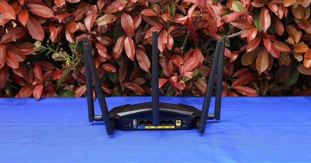背部是接口及功能区,最左侧的是信号强度选择开关,可以选择不同的功率强度,有1X,5X,10X三档选择。旁边是一个USB接口,用于连接移动硬盘或者U盘,进行网络私有云共享。后面是网线RJ45接口,最左侧的是网线接入接口,其下是蓝色的WAN标识,然后从左到右,采用降序4,3,2,1,提供了四个网线接口,然后是路由器的电源接口,旁边是重启及WPS键。接口及功能区上端有很多细小的散热孔。