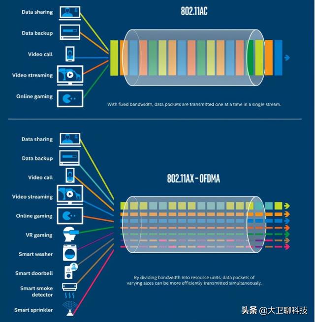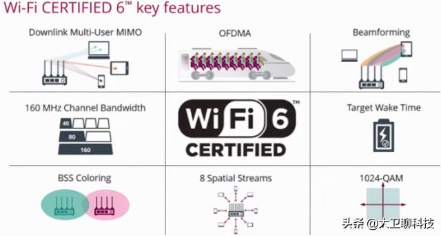 它的强大之处,就是拥有更快的速度、更强的信号以及更多的连接设备。特别是Wi-Fi 6主打的OFDMA(正交频分多址)技术,可以让多个用户的网络数据通过同一部分频宽进行传输。