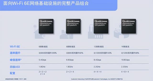 而针对路由器等网络侧,高通还推出了4款支持Wi-Fi 6的专业联网平台,包括高通400、600、800和1200专业联网平台,以及4款最新的支持Wi-Fi 6E的高通610、810、1210以及1610专业联网平台。目前,小米、中国移动、Linksys等都已经基于上述系列平台推出各自的无线路由设备。