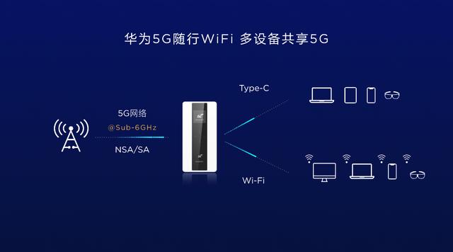 华为5G随行WiFi系列可将5G信号通过USB 3.0 Type-C和Wi-Fi两种方式传递给接入的终端设备,最多支持16台设备同时接入,可以让4G手机、平板电脑、笔记本电脑等海量未升级5G的终端也能共享5G速度。