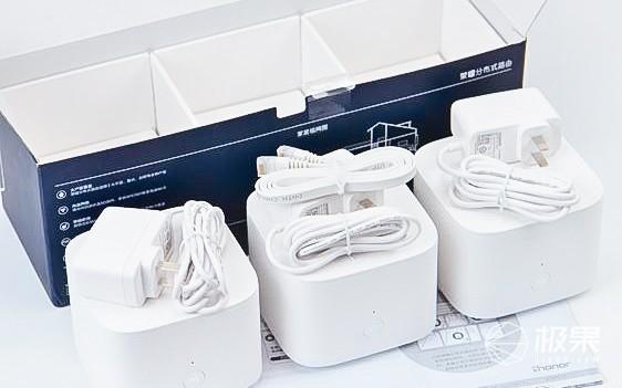 荣耀分布式路由器的全家福展示,原本以为配件很复杂其实不然,通过图片展示可以看到,有三个路由器和电源适配器,还配送了一条网线。