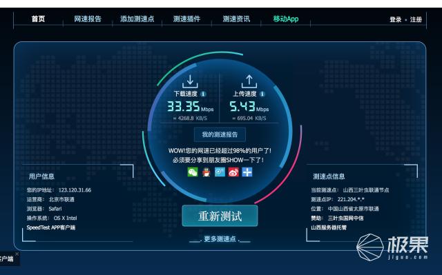 100Mb光纤,电脑测试的网速显示下载速度是33.35Mb,上传速度是5.43Mb,说明下载东西速度非常快,电脑看视频也非常流畅的。