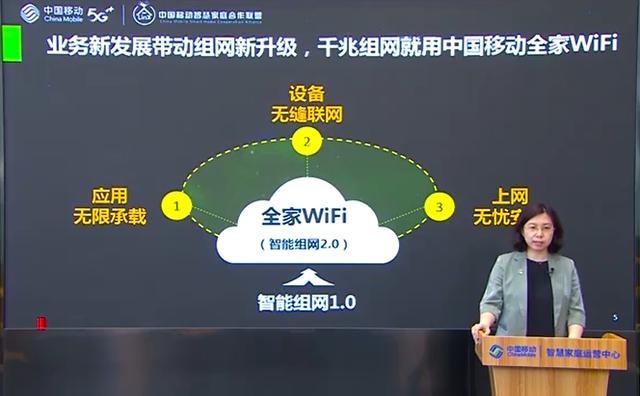 在本次发布会上,中国移动隆重推出了智能组网2.0,即中国移动全家WiFi,从新协议、新入口、新平台、新应用四方面对中国移动全家WiFi进行全新升级,并向用户提供应用无限承载、设备无缝联网、上网安全无忧的全家WiFi升级服务,实现Cloud VR、8K等大流量应用流畅运行,同时既能守护用户家庭信息安全,也能极大改善家庭网络环境,提升网络品质。