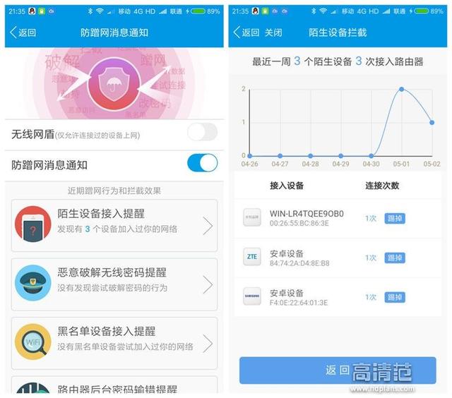防蹭网还可以称为踢人功能。防蹭网设置中,可以看到已经接入的设备和恶意破解的提醒,清楚的显示每个接入设备的联网次数。简直太贴心了。