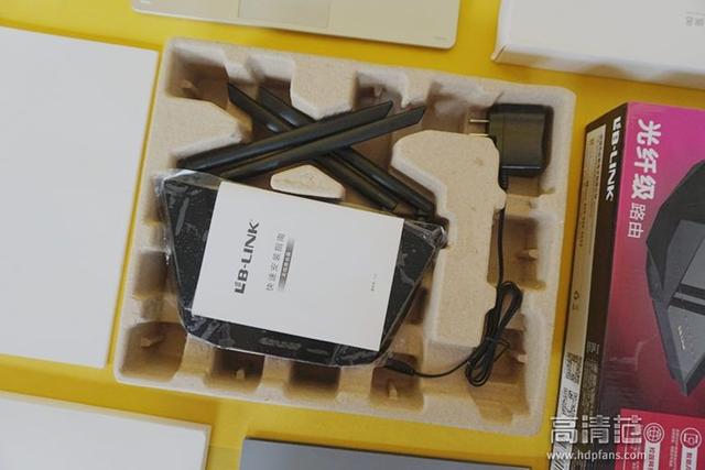 LB-LINK必联BL-AC1200D智能路由器外包装采用了单层瓦楞纸纸盒,正面是一个路由器的主图,背景是黑红色调,上端是LB-LINK的商标,下面是“光纤级路由”五个字,右侧设备的型号和产品特点。