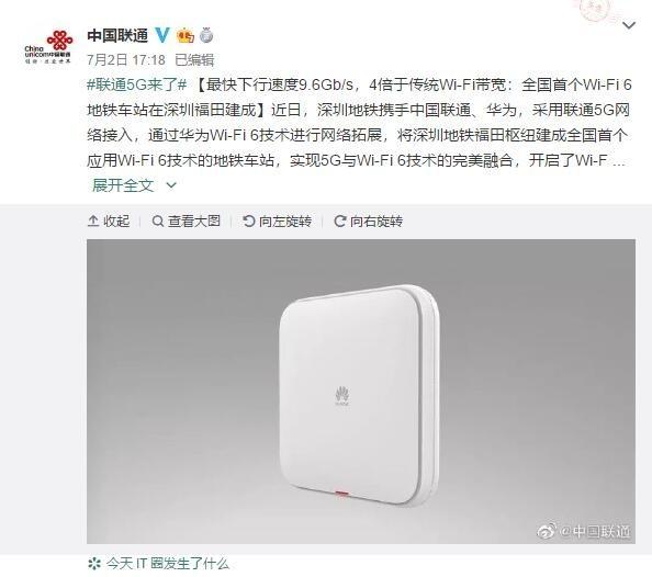 Wi-Fi 6的主要使用场景之一就是应用于在人口密集场所,比如商城、车站、写字楼等。近日,华为携手深圳地铁、中国联通将深圳地铁福田地铁站建成全国首个应用Wi-Fi 6技术的地铁车站,最快下行速度,你也能将其理解成下载速度,可达9.6Gb/s。