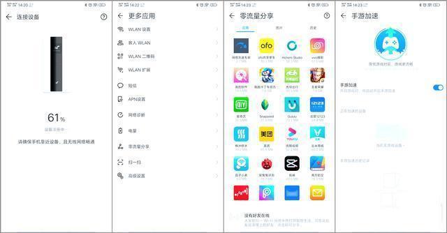 在【智慧生活】APP上,有着丰富的管理控制功能,包括流量卡套餐设置,超限断网、查看实时网速,一键体检,手游加速,WLAN设置,收发短信,接入设备管理等功能。此外,通过机身上的小显示屏也能够进行简单的WiFi分享和设置。
