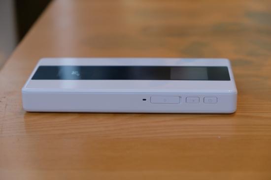 在华为5G随行WiFi Pro的上方,有一块LCD显示屏,这里显示剩余电量、网络状况,网络信号强度等信息。屏幕下方是一个5G标识,底部是华为的英文字母,整体看上去非常简洁。