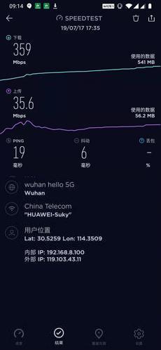 笔者使用SPEEDTEST.NET软件测试,其在5G 网络环境下,下行速度359Mbps,上行速度35.6Mbps,这速度已经与400Mbps家庭光纤网络相当,观看高清网络视频非常流畅。