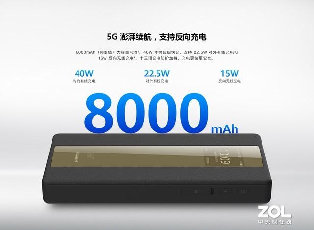 很多朋友怕5G耗电,觉得5G是个电老虎。华为5G随行WiFi Pro内置8000mAh大容量电池,5G使用时长达10小时。为其它设备充电则支持22.5W有线对外充电和15W反向无线充电功能,仅需30分钟就可为Mate 30 Pro充至约40%以上的电量。自身充电则配备了40W超级快充功能,充满8000mAh的电量仅需2个多小时。8000mAh大容量电池、40W超级快充、22.5W有线充电、15W无线充电,完美解决了华为5G随行WiFi Pro和其他终端的续航问题。
