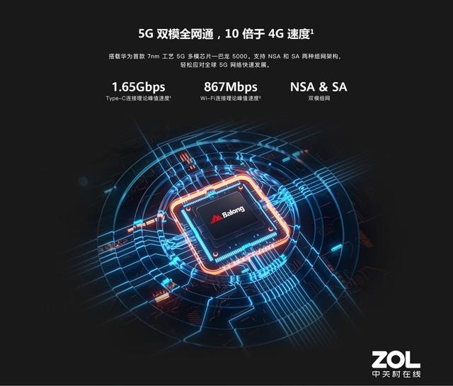 这么好用,是不是很心动呢?最后我们再来看一下,华为5G随行WiFi Pro为什么会这么强大。它内部搭载全球首款7纳米工艺5G多模芯片巴龙5000,支持NSA/SA双模组网和三大运营商5G全网通。出国使用也无需担心,它支持全球150+国家主流5G/4G频段,5G峰值下载速度高达1.65Gbps。