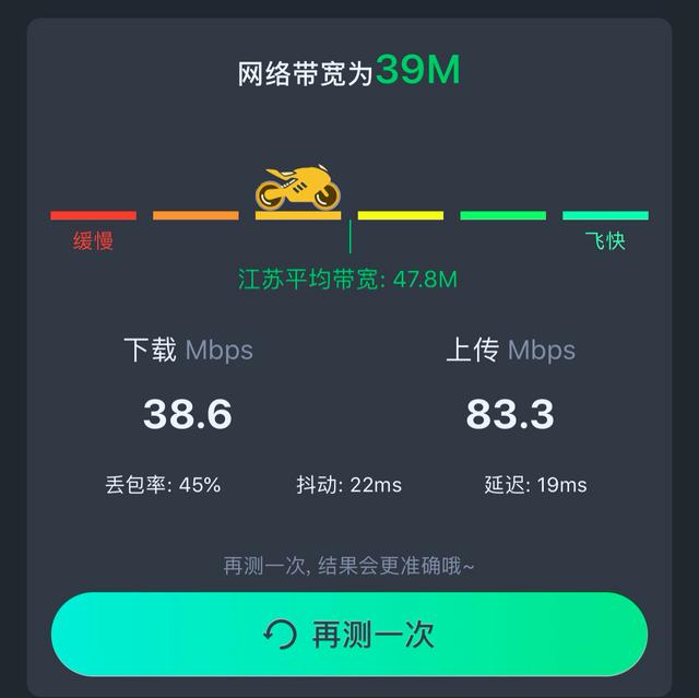 随后我们开启了默认的双通道情况下,测试的网络带宽显示为39M、丢包率45%、抖动22ms、延迟19ms。