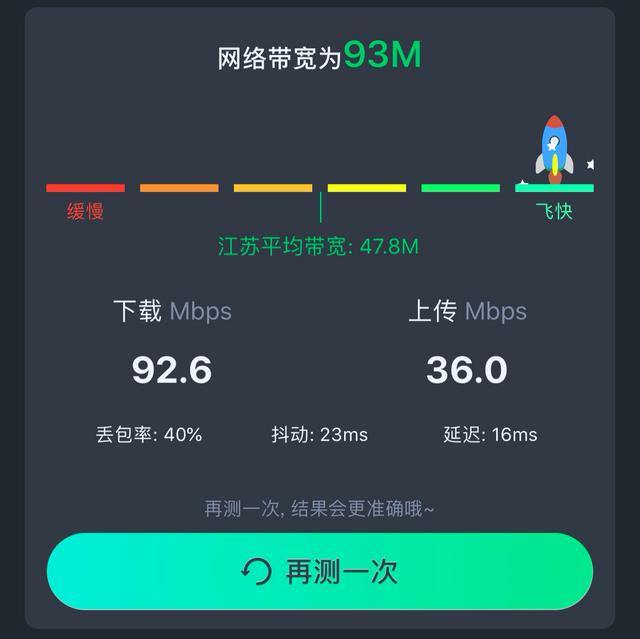 最后我们测试开启独立5G 频段,网络带宽为93M、丢包率40%、抖动22ms、延迟16ms。