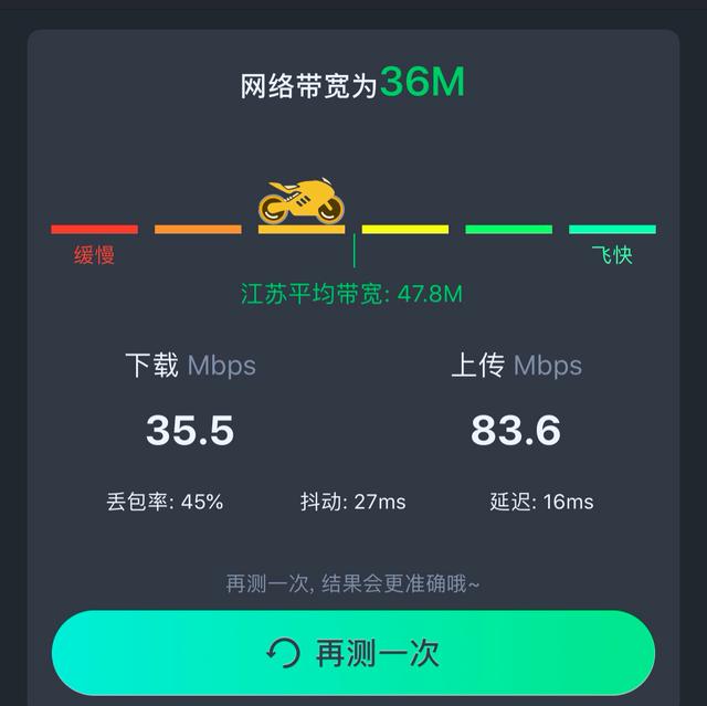 首先测试的是独立开启2.4G 频段的情况下,测试的网络带宽为38M、丢包率45%、抖动22ms、延迟19ms。