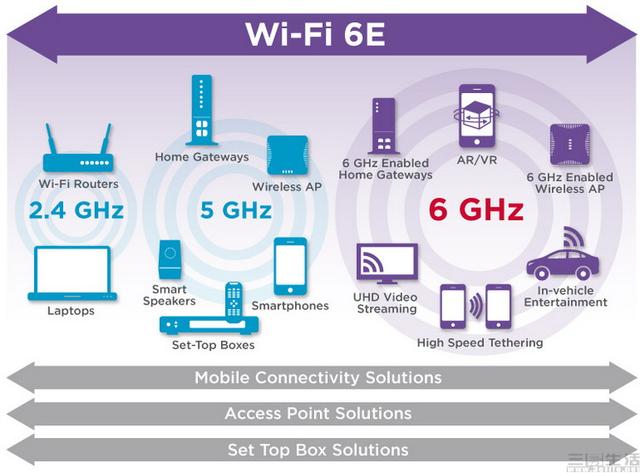 所以WiFi6E的解决办法就很简单粗暴,其在WiFi6原本2.4GHz、5.2GHz、5.8GHz频段的基础上,再多加了一个6GHz-7GHz的超大频段。由于这个频段以往并没有什么人用、无线资源非常充裕,所以WiFi6E设备就可以继续放开了手脚使用更大的传输频宽、用更多的天线堆并发,从而显著提升连接速度。