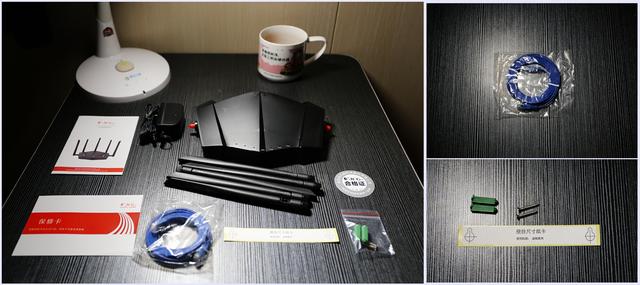 路由器提供了丰富的配件,如产品的电源适配器,高性能网线,螺丝及固定的螺纹槽,以及用于在墙上射钉的贴纸,说明书及保修卡等。提供贴纸可以方便进行射钉操作,可以将路由器固定在墙面上,从而节省空间。