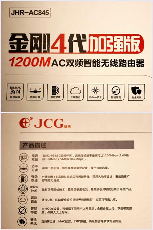 虽然有这些问题,但5G信号,代表了未来发展的方向,现在的路由器,考虑到了2.4G及5G信号的优缺点,采用双频信号,既有2.4G信号,又有5G信号,满足用户的不同需求。虽然双频路由器很多,但如前面所说,需要仔细鉴别其所采用的标准,AC标准才是真正的新一代没打折扣的5G标准。JCG(捷稀)金刚4代加强版1200M AC双频智能无线路由器就是一款真正AC标准的双频路由器。