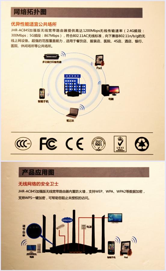 采用的AC标准,具有向下兼容性,可以兼容802.11n/b/g的无线设备上网,可以为Pad,电脑,笔记本,智能手机及多功能打印机提供信号,并且适合在餐饮店、服装店、4S店、酒店、银行、医院、休闲场合使用。产品内置了无线防火墙,并且支持WEP,WPA,WPA2等数据加密,支持WPS一键加密,保护用户的数据信息安全。并且通过了中国的3C、美国的FCC,欧洲的CE等多种认证。