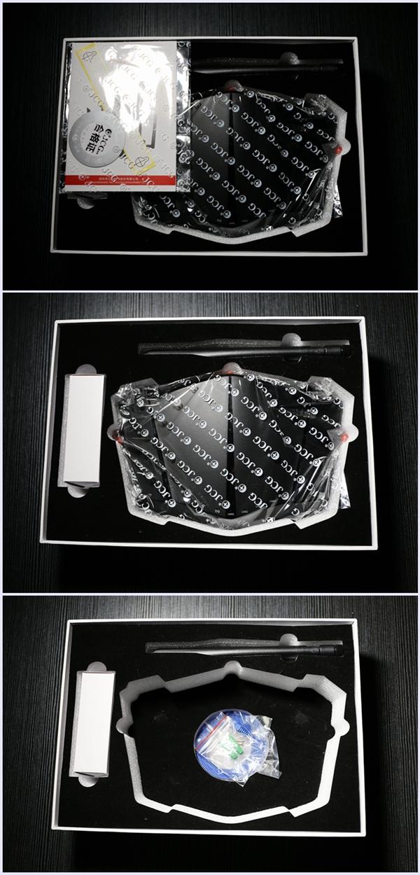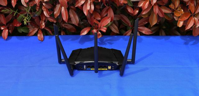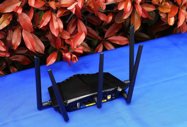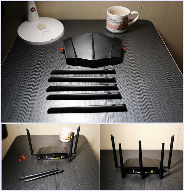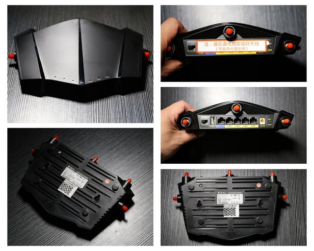 产品外型有点像豪车的前端,又有点像次世代的飞行器,亮黑色的外观,磨砂的触感,兼具神秘与时尚的感觉。路由器提供五根增益天线,都是可拆卸的,初次使用需要自己安装。接下红色的塑料盖,看到信号线采用镀金的接口,从而保证信号的清晰无干扰。