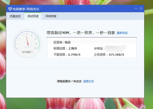 电脑上的腾讯电脑管家的网速测试速度不错,现在小区应该在20M的宽带接入,采用好的路由器以后,可以看到对网速的提升很明显,居然显示有60M的接入,难道上海的小区已经增容到100M了?