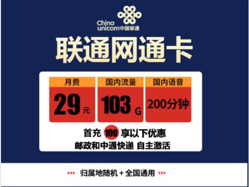 联通天联卡 29元月租103G通用流量+200分钟通话(免费办理)