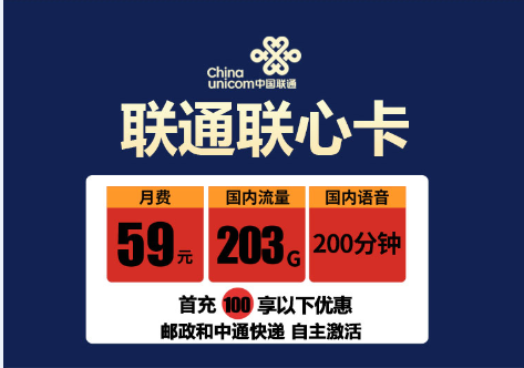 中国联通联心卡资费介绍1:每月203G全国通用流量2:优惠后59元月租+203G通用+200分钟+优惠期2年3:激活需一次性首充100元可享受优惠,不充值执行原套餐。4.归属地随机+全国通用中国联通联心卡温馨提示1、原月租:59元+200通话+1G通用,流量5元1G2、充值100后3个工作日叠加0元包102G通用...