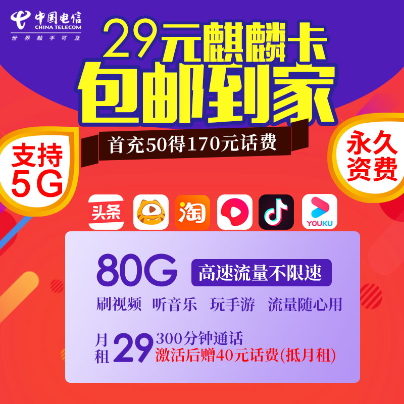 电信麒麟卡 29元 80G流量+300分钟 长期流量