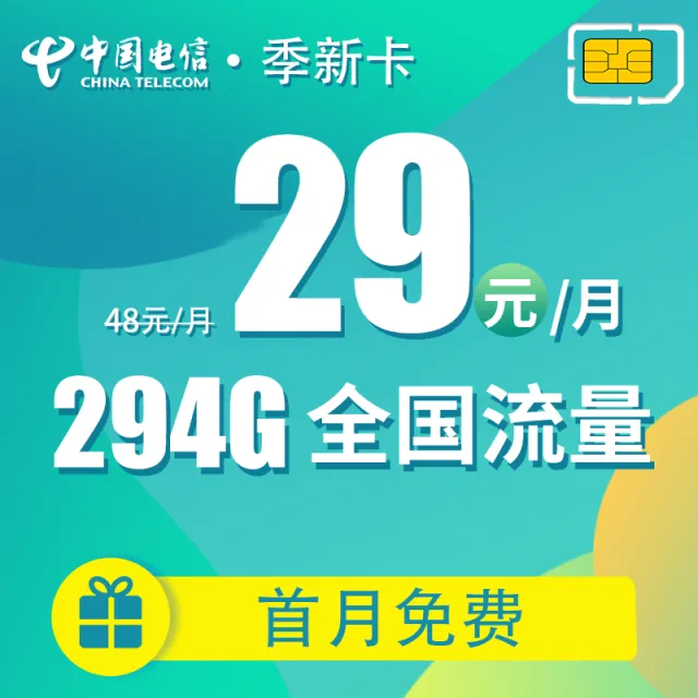 中国电信季新卡优惠月租29元,64G通用+230G定向,首月免费体验