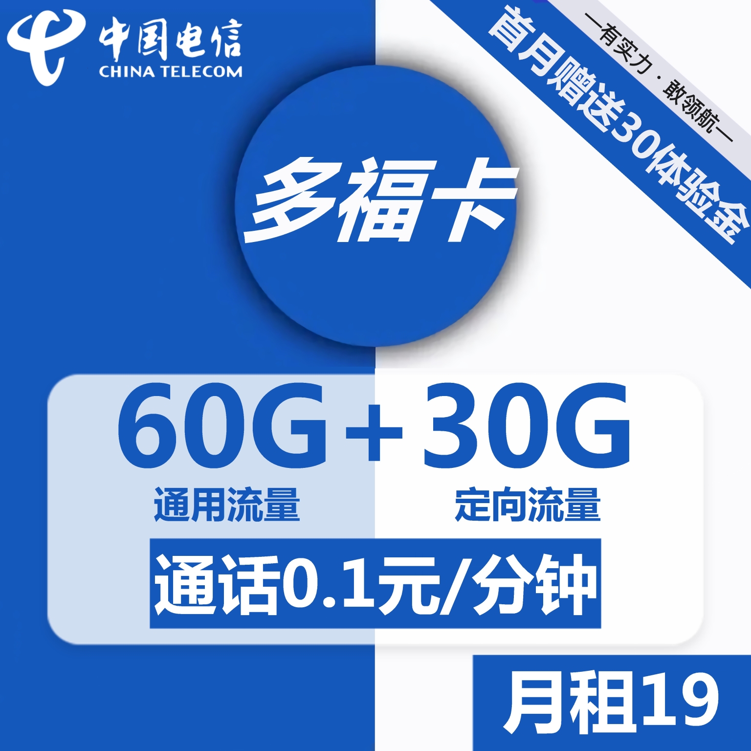 电信多福卡19元包60G通用流量+30G定向流量+通话0.1元/分钟