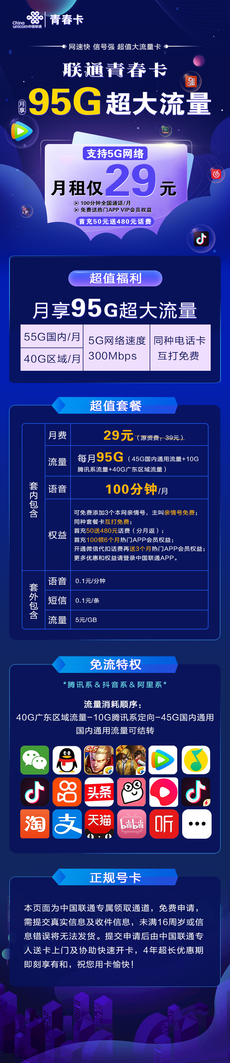 介绍:该卡属于电话卡,流量巨多,还有通话,可以注册微信使用,网速快不限速,流量是全国通用邮费:该卡免费在线下单,全国包邮到家怎么激活:会有工作人员联系你上门送卡不用了怎么办:不用了可以随时拨打客服10010注销充值话费怎么充值:微信支付宝营业厅都可以套餐是永久的吗?该卡套餐是永久性,没有合约限制怎么查询快递单号:下...