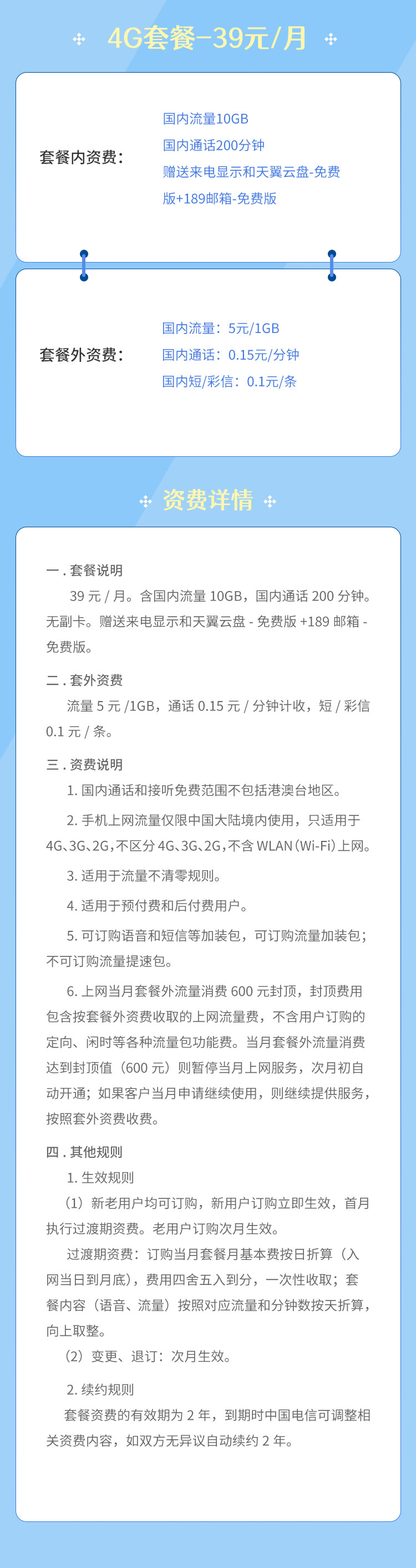 【昆明电信网厅】4G畅享单品39元,月享10GB国内流量+200分钟国内通话