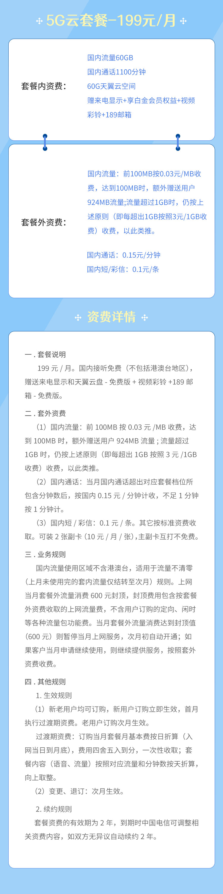 【昆明电信网厅】5G云套餐199元,月享60GB国内流量+1100分钟国内通话